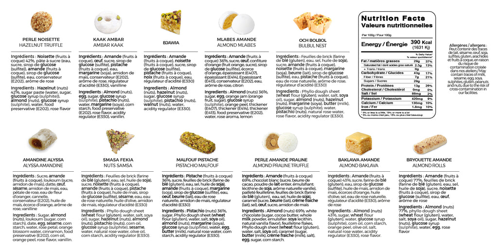 Valeurs nutritionnelles pour 100g : Énergie 390Kcal (1631Kj), Matières grasses 29g (dont acides gras saturés 2.5g), Glucides 43g (dont sucres 29g), Protéines 13g, Sel 0.088g