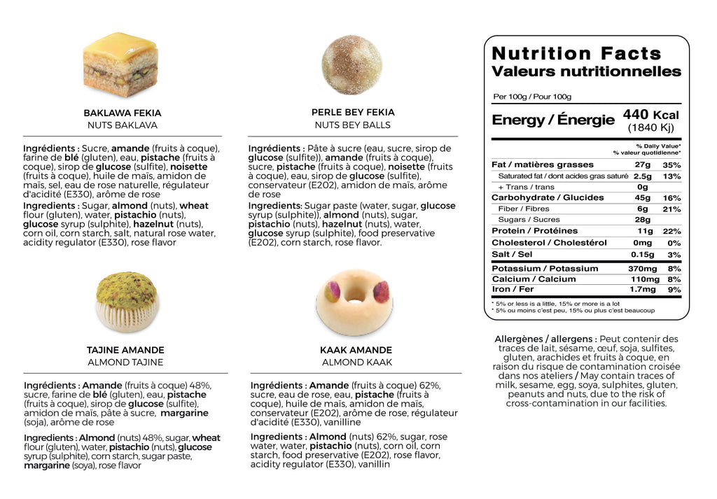 Valeur nutritionnelle pour 100g : Énergie 440Kcal (1840Kj), Matières grasses 27g (dont acides gras saturés 2.5g), glucides 45g (dont sucres 28g), protéines 11g, sel 0.15g