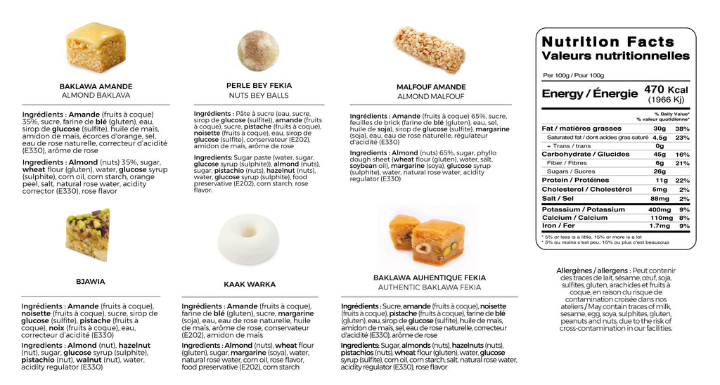 Valeurs nutritionnelles pour 100g : Énergie 470Kcal (1966Kj), Matières grasses 30g (dont acides gras saturés 4.5g), Glucides 45g (dont sucres 26g), Protéines 11g, Sel 0.088g