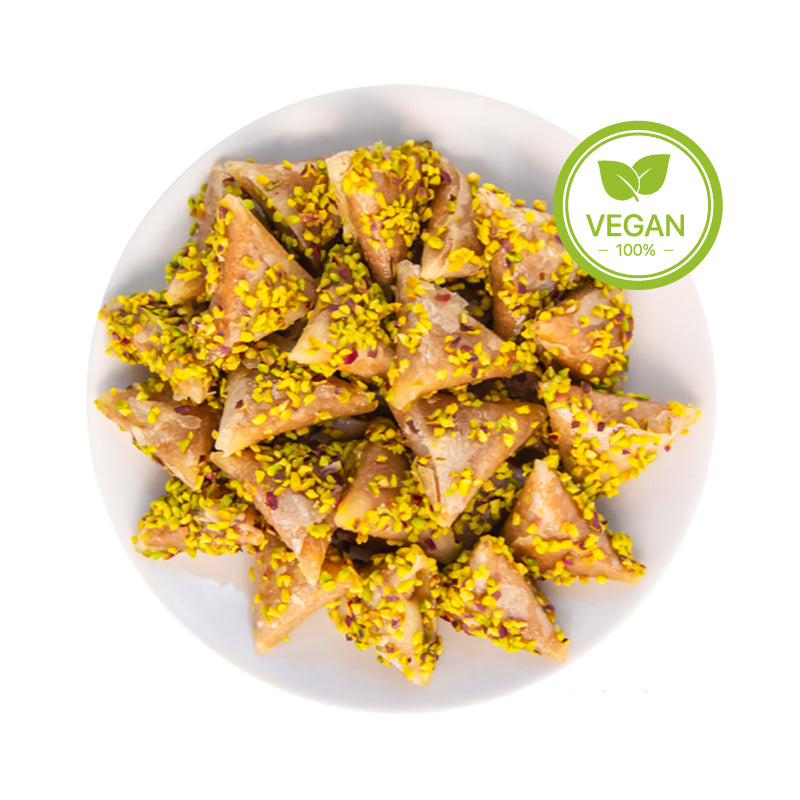 Ingrédients : Feuilles de brick (farine de blé (gluten), eau, sel, huile de soja), noisette (fruits à coque), sucre, pistache (fruits à coque), amande (fruits à coque), sésame, huile de mais, sirop de glucose (sulfite), eau, eau de rose naturelle, correcteur d'acidité (E330)