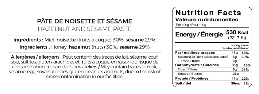 Ingrédients : noisette (30%), sésame (29%), miel, beurre