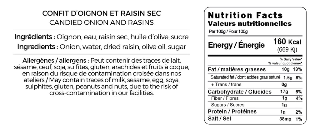 Ingrédients : oignon 41%, eau, raisin sec 16%, huile d’olive, sucre