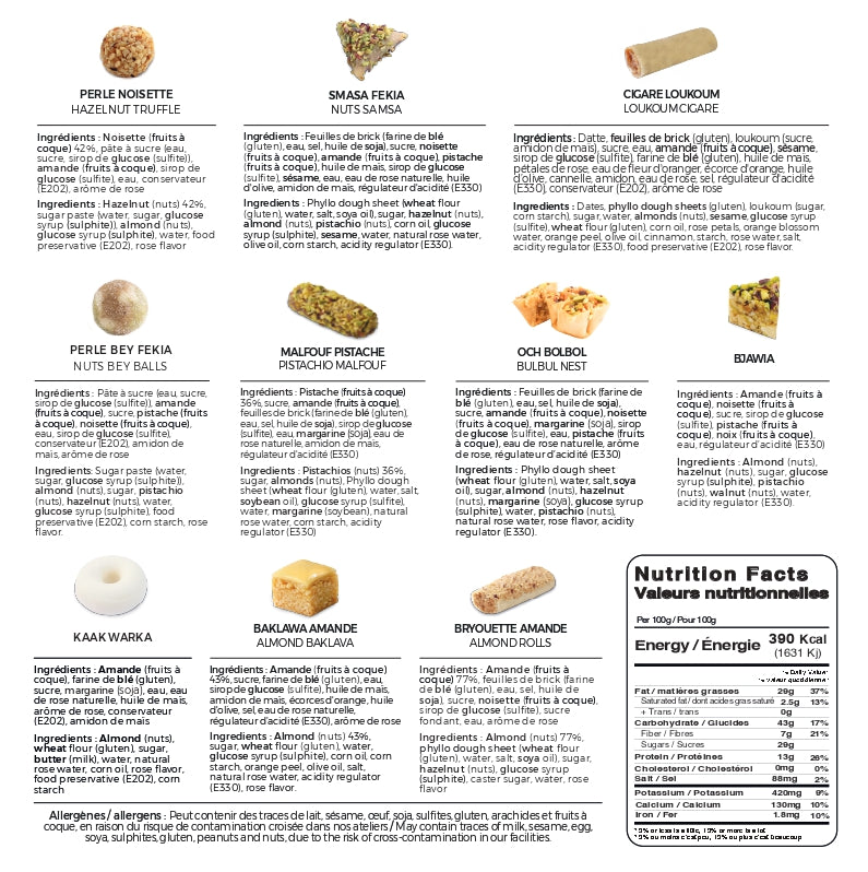 Valeurs nutritionnelles pour 100g : Énergie 390Kcal (1631Kj), Matières grasses 29g (dont acides gras saturés 2.5g), Glucides 43g (dont sucres 29g), Protéines 13g, Sel 0.088g